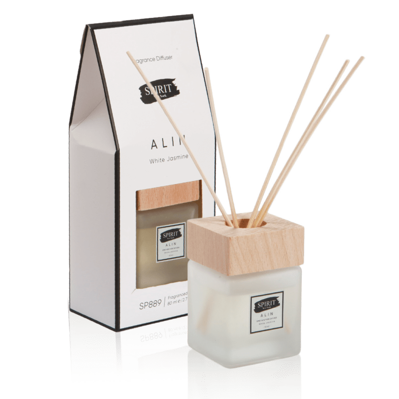 Fragrance diffuser in a glass bottle in an elegant design and a square bamboo stopper from